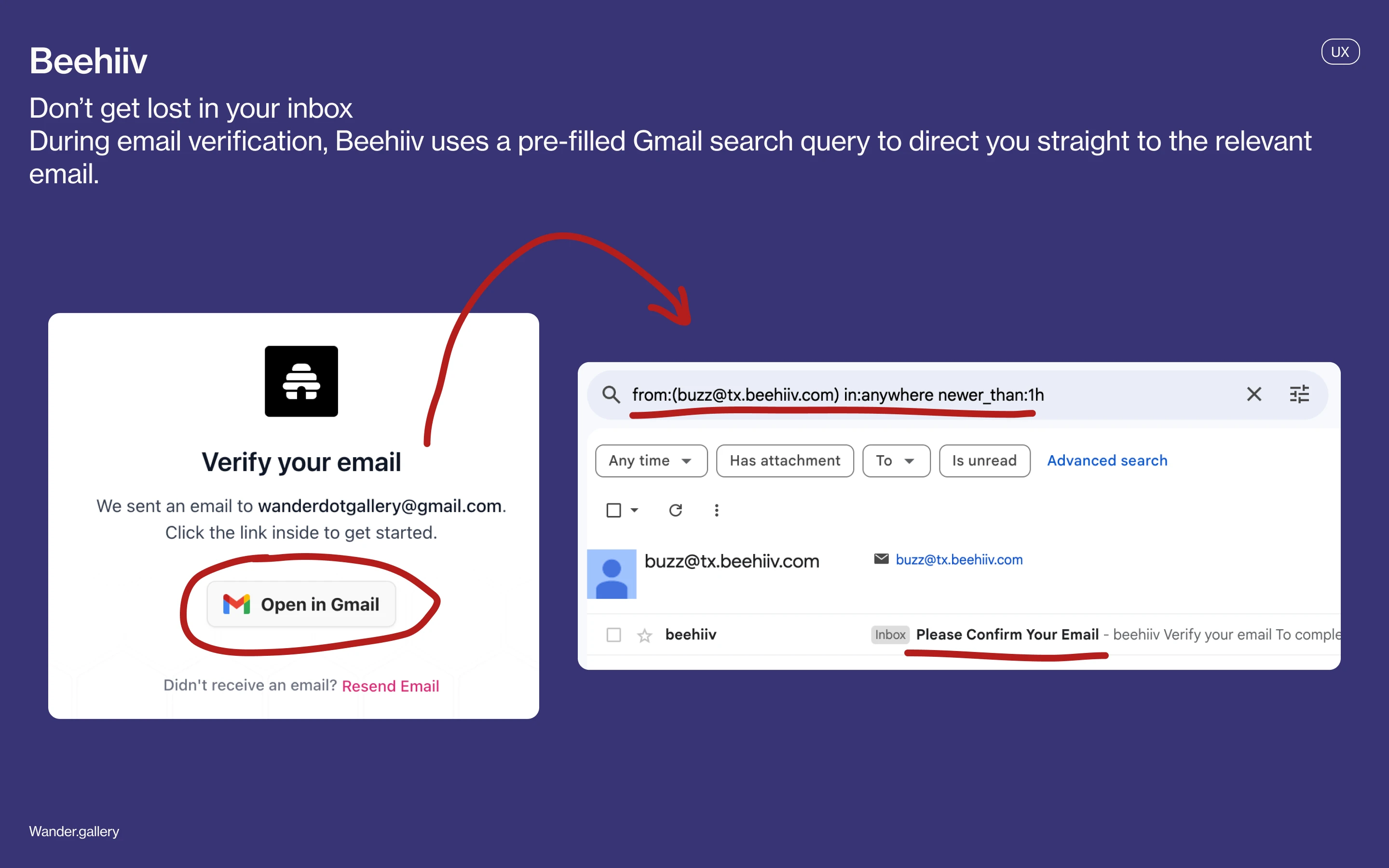 During onboarding, Beehiiv asks you to verify your email. Instead of simply opening your inbox, it generates a pre-filled Gmail search query and filters your inbox to emails sent from Beehiiv within the last hour, ensuring you don't get distracted looking through your inbox and that you actually complete the onboarding step.